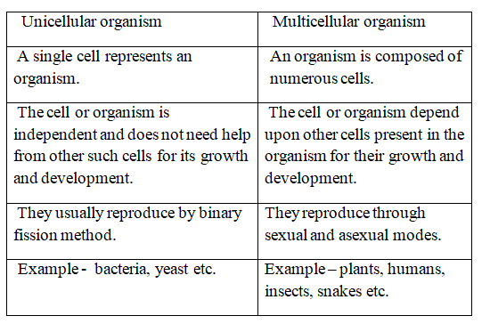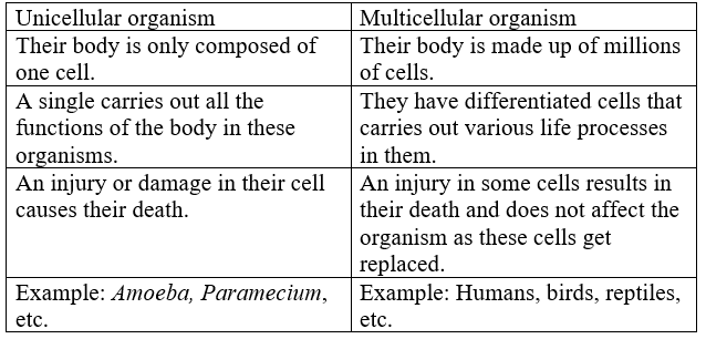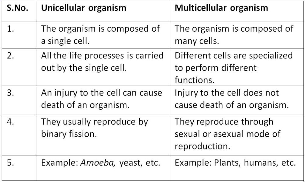 Difference Between Unicellular And Multicellular Organisms In Tabular Form